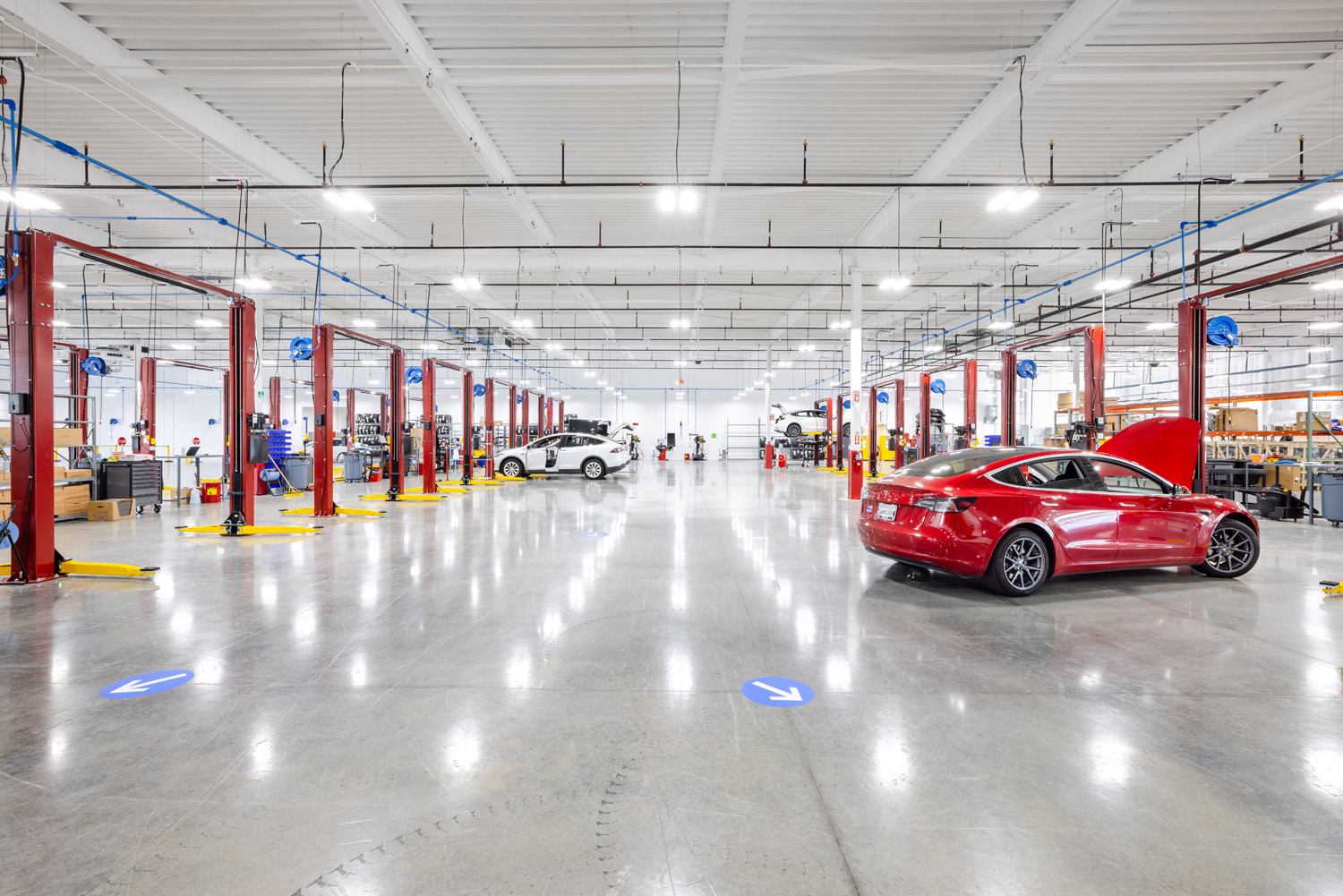 This former Mini Cooper dealership was actually already a LEED (Leadership in Energy and Environmental Design) building. Sometimes, you don't want to touch a good thing, so our modifications to the building remained minimal, though we did structurally reinforce the glass cube above the front door so a parked Tesla could comfortably fit. And, because it's Tesla, we also revised the entire service bay area to accommodate their electrical vehicle needs.